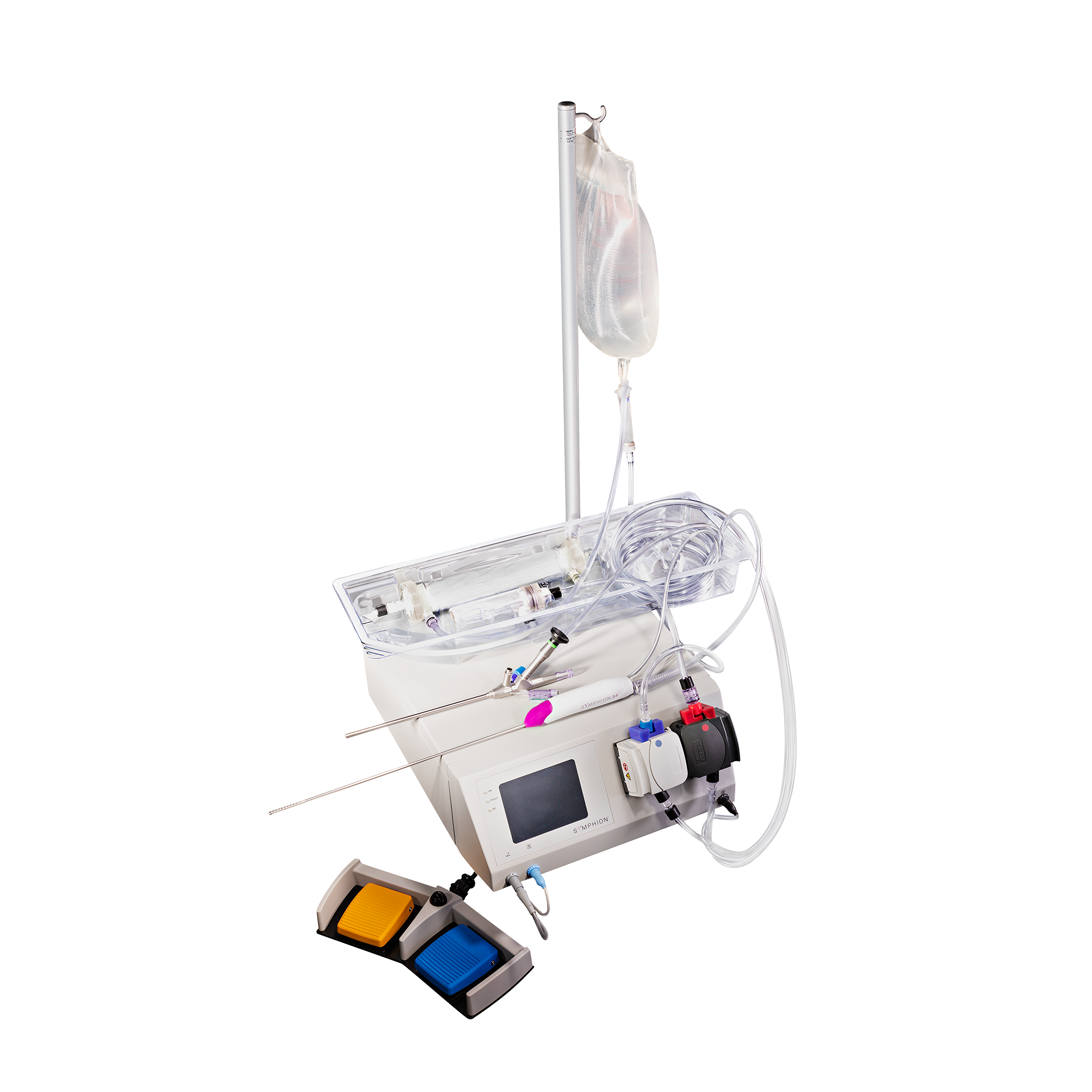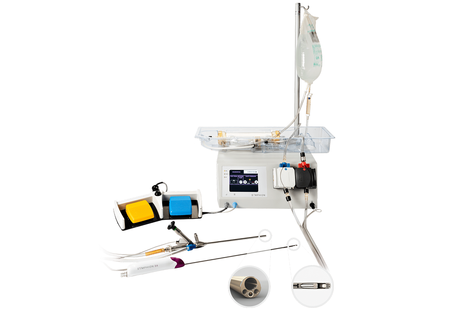 Symphion is designed to volumetrically limit the amount of distention media that potentially can be absorbed, and this value will never exceed 2500mL. This is achieved via Symphion’s “closed loop” fluid management system. The re-circulating distention media allows the user to calculate the fluid loss by simply subtracting the remainder of fluid in the 3000mL saline bag from the operating volume of 2500mL. However, an optional fluid deficit readout accessory is available for use with the Symphion Prime controller.